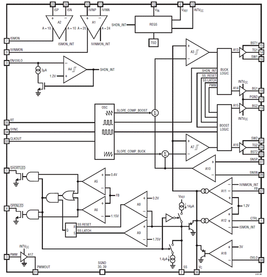 Three sense resistors provide constant output current control and monitoring, peak switch current control, and DC input current limit and monitoring. The ISMON and IVINMON outputs tell the user how much current is flowing through the output and input sense resistors.