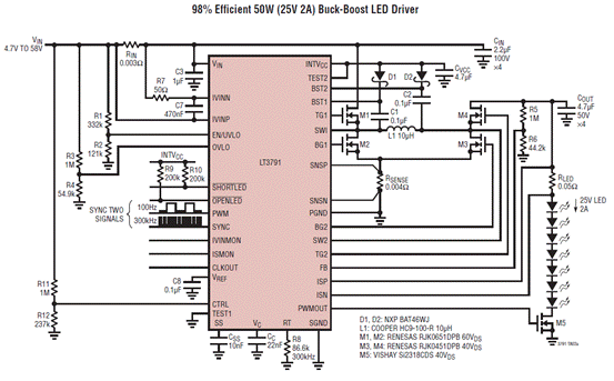 图2.LT3791效率98% 50W(25V2A)升-降压LED驱动电路图