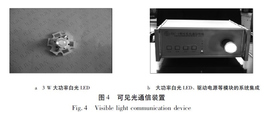 为测试所制作的双DC /DC 并联供电系统的性能,采用3 W 大功率白光LED( 额定电流750 mA、额定电压4. 0 V) 做了驱动实验与性能测试,LED 的照片如图4 所示。将大功率白光并联供电系统、大功率白光LED、数据编码模块、Bias-Tee 耦合模块以及按键/指示灯等进行了系统集成,研制了兼具照明与通信双重功能的通信装置( 见图4b) .利用该装置,对给出的并联供电系统进行了实验。