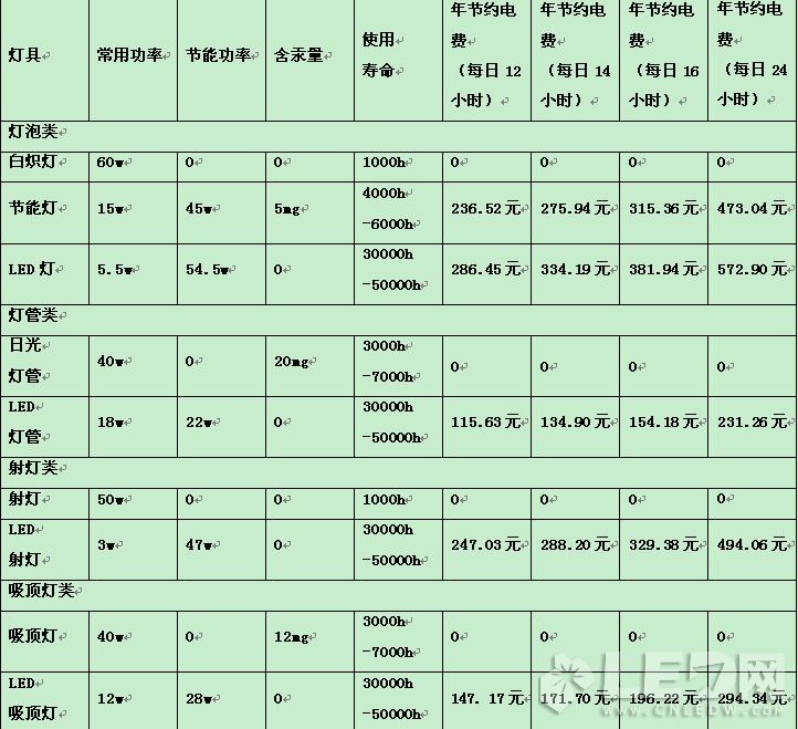 我国政府已将“节能减排”作为国策。随着国家“节能减排”工程深入开展,“绿色照明工程”已被列为我国重点推广项目和节能产业跨世纪战略。中国照明行业已经步入了产业升级的分水岭。在呼吁照明节能减排的大背景下,高效节能的LED产品是一个产业升级的焦点,被称作是“照明领域新革命的开始”,集环保、长寿命、高效节能、高显色性、无频闪、无紫外线、不招蚊虫、瞬时启动、宽电压工作范围、大宽度工作温度范围等诸多优势于一身。其能环保的优点更是节能照明产品中的领头羊。如果我国每年有10%的传统光源被LED 代替,可节电90 亿度,相当于减排二氧化碳864万吨。目前,LED 照明产品也已渗透到社会生活各个领域。下面以几种比较常用的灯具,与LED灯具来做个比较,将LED灯具的优势量化表示出来。
