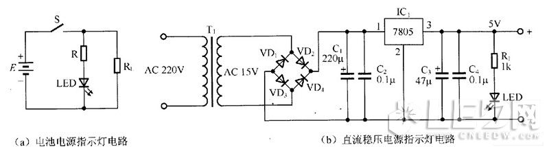 用LED作直流电源指示灯的电路如图5所示。其中,图5(a)所示为电池供电电路的指示电路;图5(b)所示为直流稳压电源的指示电路。在图5(a )中,R=(E一VF)/IF。