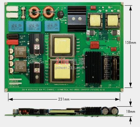 由式(1)显然可见,一种具有众多高效特性的系统解决方案是结合交错式双临界传导模式(BCM) PFC与隔离式DC-DC转换器,其中,前者后面跟着不对称半桥(AHB),后者采用了带自驱动同步整流器的倍流整流器次级端。