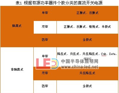 非隔离式DC/DC转换器,按有源功率器件的个数,可以分为单管、双管和四管三类。单管DC/DC转换器共有六种,即降压式(Buck)DC/DC转换器、升压式(Boost)DC/DC转换器、升压降压式(Buck Boost)DC/DC转换器、Cuk DC/DC转换器、Zeta DC/DC转换器和SEPIC DC/DC转换器。双管DC/DC转换器有双管串接的升压降压式(Buck-Boost)DC/DC转换器。四管DC/DC转换器常用的是全桥DC/DC转换器(Full-Bridge Converter)。隔离式DC/DC转换器在实现输出与输入电气隔离时,通常采用变压器来实现,由于变压器具有变压的功能,所以有利于扩大转换器的输出应用范围,也便于实现不同电压的多路输出,或相同电压的多种输出[2]。以上种种繁琐的分类可以用表1给出。