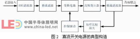 直流开关电源的典型构造图如图2所示,市电交流输入进入EMI滤波器进行初级滤波,使本地电源和电网上千家万户的负载进行一定程度的隔离,整流即将交流电转化为高压直流电,再次滤波后进入变换电路变为交流电流入高频变压器的初级线圈,次级线圈就产生了低压交流电,再次整流和滤波后得到了适合我们需要的低压直流电,开关电源同时采用反馈控制,不断比较输入和输出,可以取得更干净输出的效果。别看开关电源的原理貌似非常简单,但其对器件如开关管的开关速度、导通电阻等有着很高的要求。开关电源高频化是其发展的方向,高频化使开关电源更加小型化,并使开关电源进入愈加广阔的应用领域 [2]。
