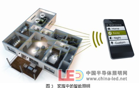其实,一直与LED驱动紧密绑定在一起的LED光源身上有着种种潜力,LED光源不止是照明,决定了LED驱动也不仅仅是个电源。都说“LED高科技”,高科技体现在哪里呢?仅仅是光效吗?不全是。高科技体现在研发、生产、工艺等方面。还有它与传统照明光源最大的不同,那就是它的出身其实是一个半导体芯片,这一点决定了LED光源可以像其他的半导体芯片,如CPU、GPU、FPGA、ARM等一样,具有“潘多拉魔盒”的魔力,具有“芥子能纳须弥”的神奇,魔力和神奇离不开驱动的提携(当然是带有半导体智能控制芯片的驱动),这也就是智能照明(smart lighting)概念的源头所在。有了智能照明,我们可以实时监控照明的能耗、照明的状态,更加突出节能的概念。不仅仅如此,照明能够根据环境光的强弱和场景自动调节。设想一下,静静的夜晚,路灯们自动调节为低功率输出,有汽车和人出现时调高输出功率,离开时再调回原状;夏天时,屋内自动调为冷色调……家庭中智能照明的一种应用场景如图3所示[4],通过智能手机,我们可以控制客厅、卧室、书房等空间LED照明的亮度、色温、分布,监控照明的耗电状态并带有用户随意定制的功能。