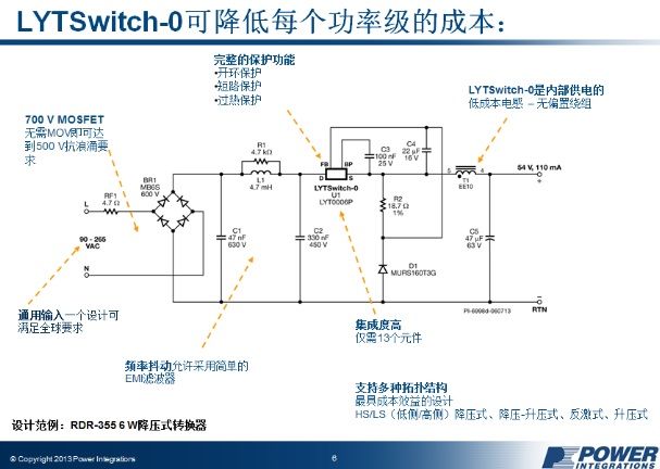 为了应对这一趋势,PI最近推出了一款最高功率可达10W的LED驱动器IC------ LYTSwitch-0,该芯片具有高能效,可降低热量和提高产品寿命,其提供的功率因素校正可满足全球范围内的家用照明要求。它主要应用于GU10和蜡烛灯等低成本LED灯泡。据Andrew Smith介绍,LYTSwitch-0适用于紧凑型、高成本效益LED灯泡和灯管的非隔离式驱动器。由于集成度高,它可实现低元件数的电路设计,另外,它还支持多个拓扑结构,比如HS/LS(低侧/高侧)降压式、降压-升压式、反激式、升压式,可满足不同的应用要求。同时,它还具有Power Integrations器件所应具有的多项安全功能,比如开环保护、短路保护和过热保护。 从给出的一个使用LYTSwitch-0 IC和13个元件设计而成的GU10 LED驱动器案例中可以看到LYTSwitch-0高集成度、简单和灵活的特点。Andrew Smith表示,“由于该器件具有小尺寸和高效率的特点,无需对LED驱动器使用散热或灌封处理,从而可以降低制造成本;其次,在不同输入电压和温度下均提供严格的恒流控制,这样可以降低过度设计成本;另外,该器件集成了700V的MOSFET,无需MOV即可达到500V抗浪涌要求。”