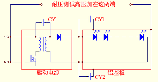 图中CY是驱动电源的Y电容,CY1和CY2是铝基板正负极铜箔和铝板间的分部电容。耐压测试时的高压直接施加到CY和CY1/CY2之间。等效下图。