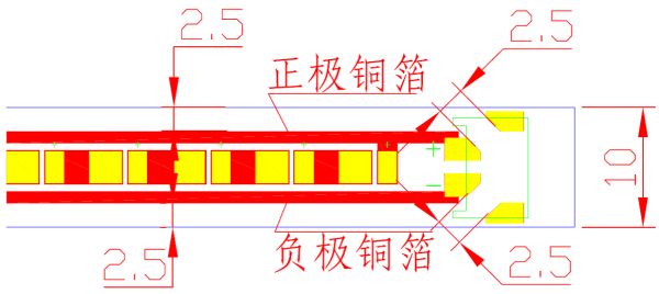 两块平行的金属板加上中间的介质就组成一个电容,板的面积越大,板距越小,容量就越大。铝基板中间绝缘层相当于电容介质,它的厚度在成品后就不能改变了。绝缘层的耐压值有常用的2.5KV左右和更高级别的4KV的等等。根据性价比选好铝基板后就要按照其性能进行综合考量配套设计。一般来说,如果驱动电源耐压值已经够大了(如大于3KV),可以把大部份高压值加到电源上,让铝基板承受的高压更低些。这个目标的实现就是加大铝基板的铜箔面积,使分布电容尽量大些。具体要求是让正极铜箔总面积尽量比负极大,同时保证有足够的爬电距离。一般2.5KV的铝基板,整板的爬电距离不能小于2.5MM.。这样才能确保铝基板不存在薄弱环节,在电压较高时不致于击穿。下图是一款已批量生产的T8LED灯管的铝基板图,配合耐压3.75KV的隔离电源,5kv的输入线,整灯耐压达4KV,生产过程全数测试耐压1.5KV,几乎不死灯珠。