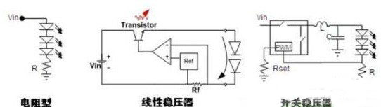 采用DC-DC电源的LED照明应用中,可以采用的LED驱动方式有电阻型、线性稳压器及开关稳压器等,基本的应用示意图参见图4。电阻型驱动方式中,调整与LED串联的电流检测电阻即可控制LED的正向电流,这种驱动方式易于设计、成本低,且没有电磁兼容(EMC)问题,劣势是依赖于电压、需要筛选(binning) LED,且能效较低。线性稳压器同样易于设计且没有EMC问题,还支持电流稳流及过流保护(fold back),且提供外部电流设定点,不足在于功率耗散问题,及输入电压要始终高于正向电压,且能效不高。开关稳压器通过PWM控制模块不断控制开关(FET)的开和关,进而控制电流的流动。