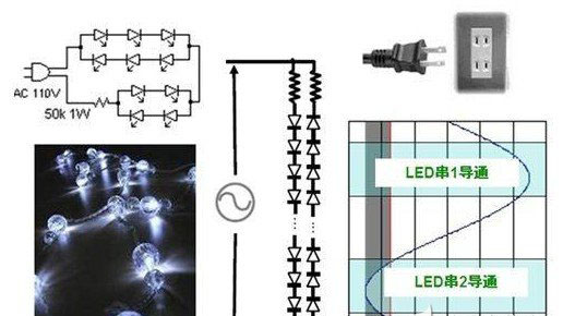 采用交流电源直接驱动LED的方式近年来也获得了一定的发展,其应用示意图参见图5。这种结构中,LED串以相反方向排列,工作在半周期,且LED在线路电压大于正向电压时才导通。这种结构具有其优势,如避免AC-DC转换所带来的功率损耗等。但是,这种结构中LED在低频开关,故人眼可能会察觉到闪烁现象。此外,在这种设计中还需要加入LED保护措施,使其免受线路浪涌或瞬态的影响。