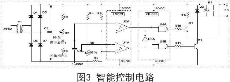 智能控制电路能够根据使用者所设定的亮度自动开、关灯,其C、D接口(参见图1)接入的电路主要由LM339以及74LS02构成,具体如图3所示。