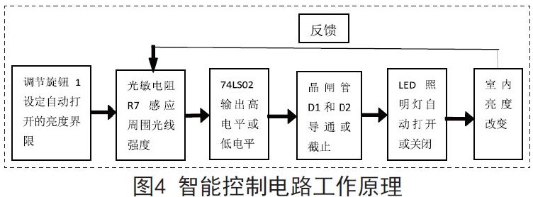 其中,R6的阻值大小可以根据不同环境设置开关的灵敏度,而LM339主要比较R5两端的电压是否在光敏电阻两端电压和R6两端的电压之间;74LS02主要将比较的结果装换为高低电平,进而通过三极管和继电器来控制晶闸管的导通、关断;调节调节旋钮1可以设定连续的开、关灯所达到的亮度界限。智能控制电路主要是通过控制晶闸管D1和D2(参见图1)的导通和截止来控制照明设备变亮和熄灭,其工作原理如图4所示。