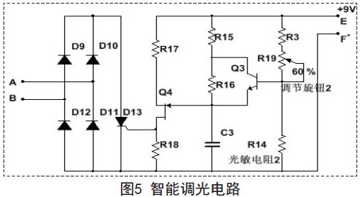 当LED照明设备开始工作后,本文设计的智能开关会依据环境照明情况的变化,通过智能调光电路自动地改变照明设备的亮度。图1所示的智能调光电路接口A、B接入的电路如图5所示。
