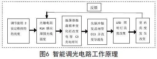 智能调光电路的工作原理如图6所示,其中R19阻值的改变导致振荡器频率变化,而这种频率变化能够改变电容C3的充电时间,由此产生的尖脉冲可以控制晶闸管D13的导通角,进而控制灯具两端的有效电压,以达到控制灯具亮度变化的目的。