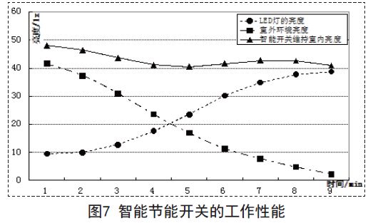 图7所示曲线表明,当室外环境光线亮度逐渐变弱时,本文的智能开关能够自动调节LED灯的亮度,使其逐渐变亮,从而使得室内的光线亮度保持在预先设定的范围之内。同理,当室外光线亮度逐渐变强时,智能开关能够控制LED灯的亮度逐渐变暗,以维持预先设定好的室内亮度。由此可见,在保持室内亮度的前提下,使用本文设计的智能开关可以节省LED灯的耗电量。