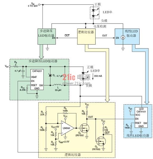 图1 LM393比较器监测LED串的低侧电压,并使能降压稳压器(CAT4201)或线性稳压器(CAT4101)。