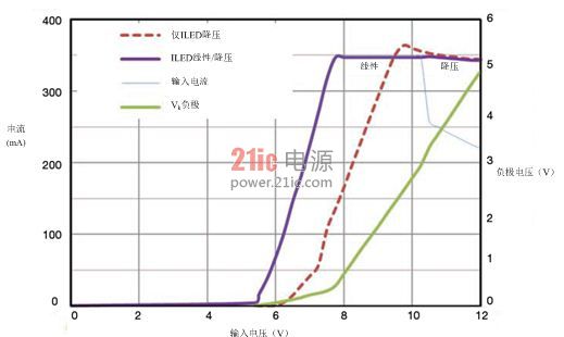 图2 与仅用降压转换器相比,线性/降压电流阱可将电流的调节范围扩展至更低的电源电压(8V以下),并降低低电量情况下的EMI.因此,LED在电池电压低的情况下也可保持点亮。
