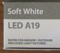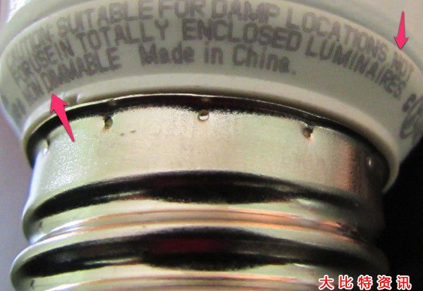 外包装上很难区分,唯一可区别的标识是在非可调光包装侧面的下角,灯泡的下部,见图上箭头指示。而可调光版本没有任何标识,这会让消费者在超市及买回家后都难以分辨、易混淆。包装混乱的另一个例子是:在软包装处标识“额定室内/室外封闭的灯具”(见下图),但在上图中不难看出,灯泡本身标识“不可在完全封闭的灯具中使用”。