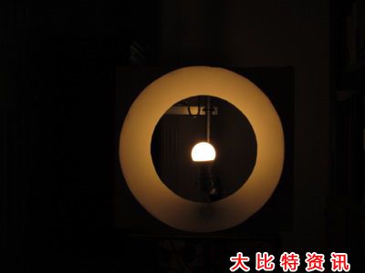 灯泡的光模式又如何?灯泡的设计为sno-圆锥形,LED芯片呈平板式排布,其投射出来的光像聚光灯或手电筒的光束。这意味着,灯泡不是全方位的,像一个白炽灯,甚至像一个节能灯。下图粗略显示了灯光的分布,灯泡底部有明显的黑斑。一个sno-圆锥形设计本身就会产生这样的光,美国能源之星规定全方向的灯应产生均匀的光束角为超过270°(±135),下图的沃尔玛灯泡塑料盖可以说明为何sno-圆锥形设计难以实现这种光模式。