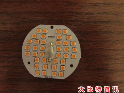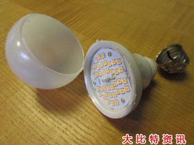 可以看到,38个塑料封装LED元件在一个金属芯印制电路板上,而这又装在一个圆形的金属板上。此金属板的重要性在于,它从LED的印刷电路板的热量传输到圆形金属套环,它将热量通过灯泡底座散发到周围空气中。请注意,这个金属底座没有其他LED灯泡常见的散热鳍片。测试金属底座变热的温度为150°F(约65摄氏度)。