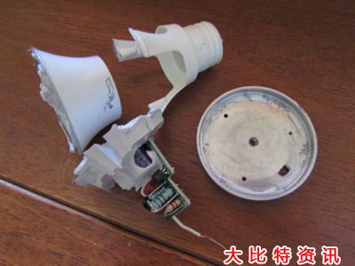外壳是塑料的,外壳下面基本是铝。这个塑料盖本是不可拆卸的,这里是切割开的,不可拆卸是件好事,因为大多数LED灯泡都是非隔离式LED驱动器设计,这意味着当外壳拆卸时交流电网电源是暴露的,不安全,因此沃尔玛这一坚固的灯泡外壳设计的不错。