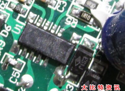 下图为驱动电子设备:灯泡的关键部件是处理所有功率控制算法的集成电路。请注意,该芯片具有一端10个引脚,然后另一端2个引脚。这个差距可能用来隔离IC的内部电路从低电压的高电压部分。