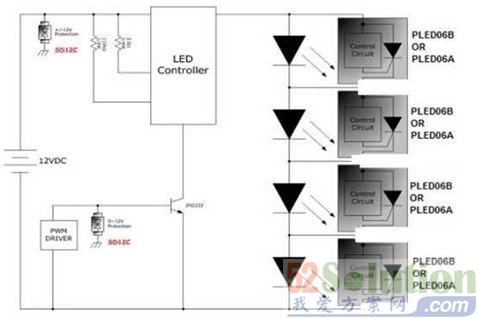 汽车灯稳定有一法,LED开路保护元件(PLED06B,PLED06A)并联在每颗灯珠旁边,示图如下: