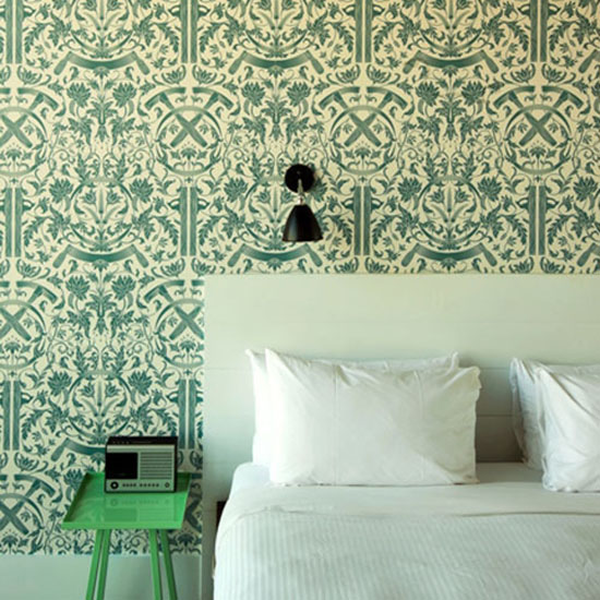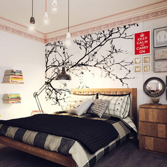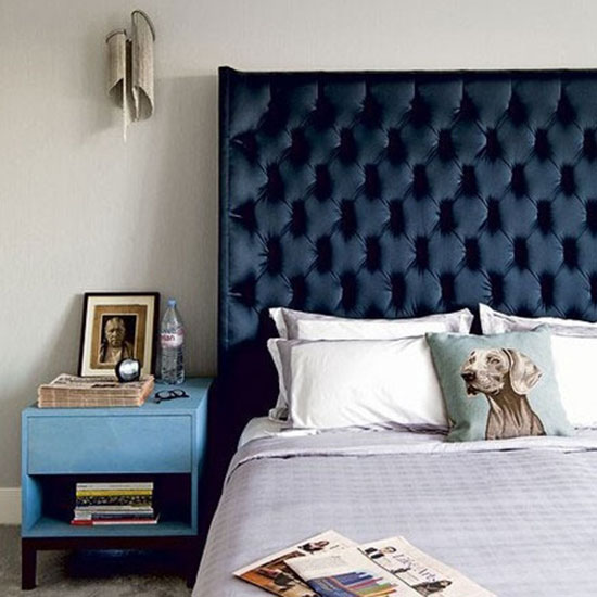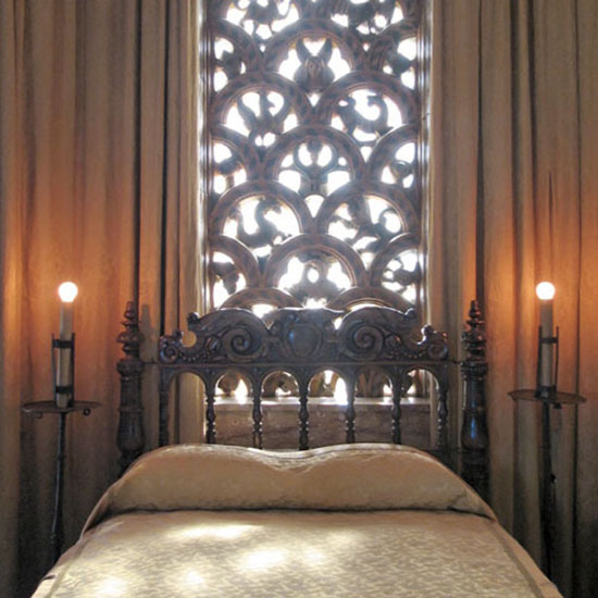 在卧室床头安装灯具主要是为了方便阅读和起夜,所以吸顶灯或大型吊灯这类完全可以充当卧室主光源的灯具并不适用于床头。如果你不想在卧室安装过多灯具,那么干脆就不要安装大型照明工具,直接安装实用的床头灯即可。而这间卧室里的床头灯也的确另类,它似乎有烛台的外形,却又宛若“天外来客”,让人产生了一种仿佛生活在神秘古堡的错觉。