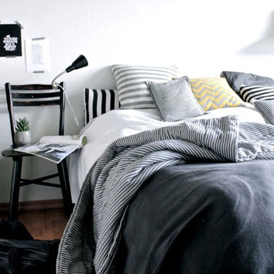 小户型的卧室往往空间不足,摆好双人床后,早已没有多余的地方摆放其他家具,因此,迷你款的床头柜会更加实用。由于这样的床头柜台面面积不大,所以肯定摆放不下传统的床头灯,此时就轮到线性吊灯大显身手了!在这间卧室里,黑色的线性小吊灯悬挂在床头,不仅没有多占用空间,反而成为了卧室中低调的点缀。