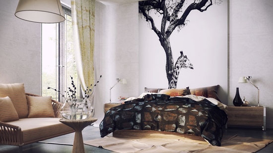 男性的卧室设计一般线条刚硬,颜色也偏暗,在床头灯的选择上可以继续延续简约风格,也可以选择线条柔和的灯具设计来缓和过于死板的线条。白色的墙面、利落的窗帘、简单的床品等已经确定了这两间卧室简约的基调,不过,第一间卧室床头的长颈鹿壁纸和第二间卧室地毯上的英国斗牛犬,正好打破了空间的单调。而两间卧室床头的小台灯都采用了简洁的设计,虽然不华丽,却让卧室充满了柔和的气息,与整体卧室风格很相宜。