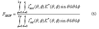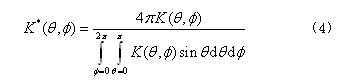 K(θ,φ) 表示在积分球内球心位置往(θ,φ)投射定量窄光束至球内壁,经多次漫反射后,探测器的读数。一般可设定K(0,0)为单位1。