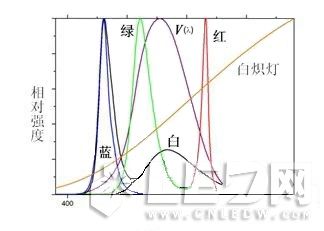 1)色温和光谱差异大。典型的白光LED是通过蓝光激发黄绿荧光粉,混光得到白色。如下图: