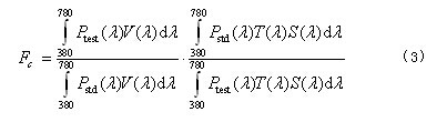 Ptest(λ) 为被测灯的相对光功率分布,Pstd(λ)为标准灯的相对光谱功率分布,S(λ)是光度测量系统的相对光谱响应度,ρ(λ)是积分球内壁的光谱漫反射比,τ(λ)是积分球窗口处的毛玻璃的光谱漫透射比。举例,若用BDP定标某球形光度计,测量某白色LED灯,修正系数为 1.01;若是测量蓝色LED,其系数可能有1.10,甚至更高。