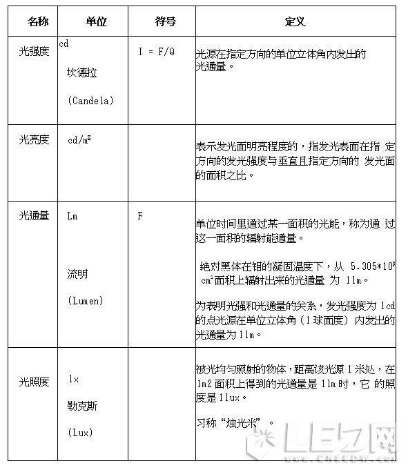 光强度/坎德拉、光亮度/cd/m、光通量/流明、光照度/勒克斯