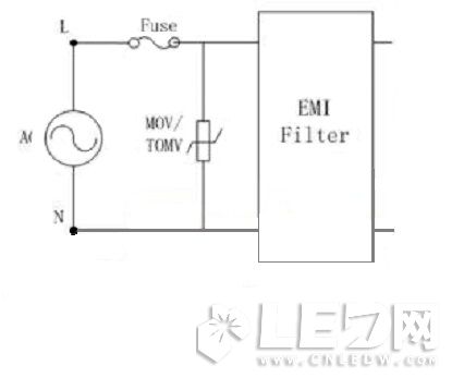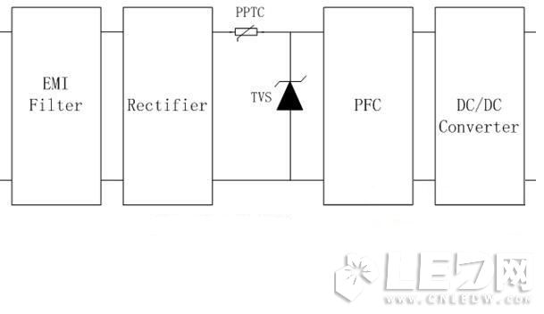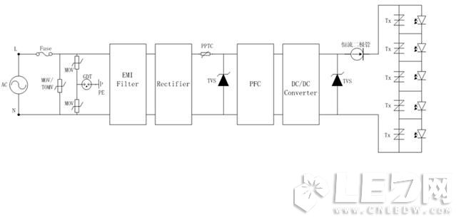 综上所述, LED驱动电路一般由AC输入、整流,、DC/DC转换、等模块组成,从而一个LED驱动电路大致整体的防护方案可以参考如图6所示: