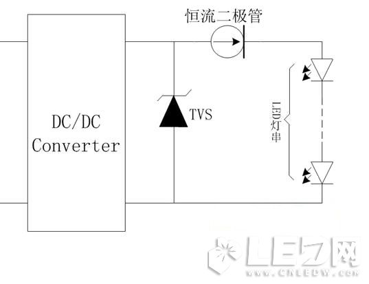 LED发光的亮度是由通过LED的电流大小来控制, 不稳定的电流又极易烧坏LED,如图4在DC/DC模块后可以在电路中串联恒流二极管来获得稳定的电流,,这样不仅可以使LED获得稳定的亮度,,又不至于因电流的不稳定而烧坏LED。低功率的LED灯工作电流一般为10mA到30mA,大功率的LED灯工作电流从200mA到1400mA不等,可以根据所需要的工作电流选择型号合适的恒流二极管。由于LED灯也易遭受到静电放电过压的干扰受损, 因此DC/DC电路后端的LED灯也需要做一定的有效过压防护,一般采用TVS管就可以。