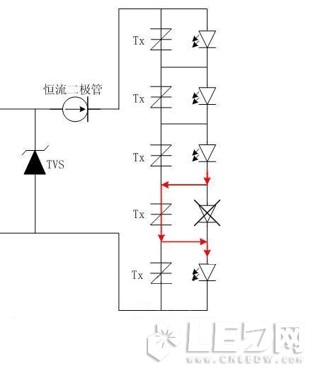 当多个的LED灯通过串联的方式进行连接时, 如图5所示,一旦出现LED灯出现失效开路故障,整个LED灯都会因为此故障而影响到其它LED灯正常工作,为了解决这个问题, 可以针对每个LED灯上并联一个防开路的LED保护器件Tx,这样就可充分的提高每个LED的使用效率,当单个LED出现失效开路故障时, 与之并联的LED开路保护器件Tx会立即导通, 使之可持续的维持处于通态,从而保证了电路中其它串联的LED不因单颗LED的开路故障而熄灭,但此防护措施成本相对比较高。