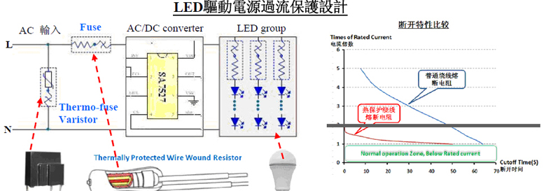 传统LED驱动电源采用电流保险丝作为过流保护,这里介绍赛尔特新设计的热保护绕线熔断电阻,拥有比电流保险丝更好的价格和性能,比普通绕线电阻更好的安全性能。