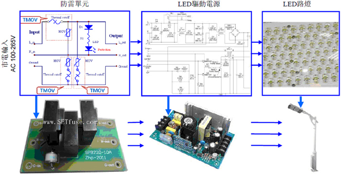 赛尔特最新研发的热保护突波吸收器(TMOV),可简化LED路灯的防雷设计。这种新型TMOV集成温度保险丝和Varistor,能够在Varistor失效着火前安全隔离,具有UL1449 第三版认证。