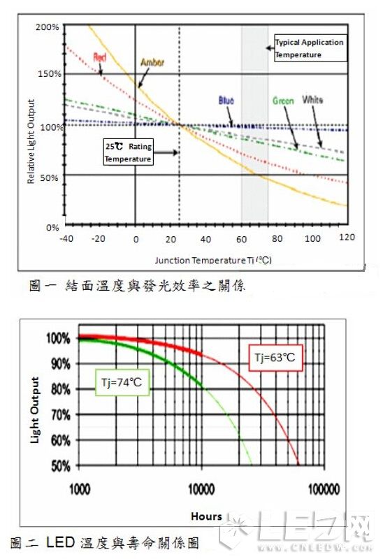 文章摘要: 一般而言,LED发光时所产生的热能若无法导出,将会使LED结面温度过高,进而影响产品生命周期、发光效率、稳定性,而LED结面温度、发光效率及寿命之间的关系,以下将利用关系图作进一步说明。 图一为LED结面温度与发光效率之关系图,当结面温度由25℃上升至100℃时,其发光效率将会衰退20%到75%不等,其中又以**光衰退75%最为严重。此外,当LED的操作环境温度愈高,其产寿命亦愈低(如图二所示),当操作温度由63℃升到74℃时,LED平均寿命将会减少3/4。因此,要提升LED的发光效率