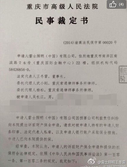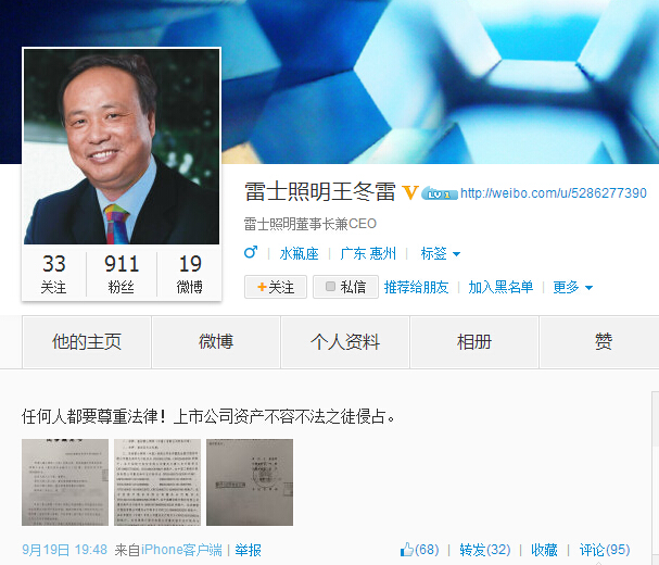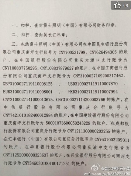 文章摘要: 吴长江和王冬雷之间的战役又有了最新进展,据王冬雷9月19日微博消息:任何人都要尊重法律!上市公司资产不容不法之徒侵占。重庆高院已经正式裁定吴长江违法侵吞上市公司资产。并附上裁决书原件。另据悉,经历日前的“雷士风波”,雷士控股有限公司惠州基地已经恢复正常生产。 综合各方最新消息,吴长江和王冬雷之间的战役又有了新进展,据王冬雷微博最新消息称,重庆高院已经正式裁定吴长江无法侵吞上市公司资产,扣押、查封雷士照明(中国)有限公司财务印章;扣押、查封吴长江私章。王冬雷在微博中说:“任何人都要尊