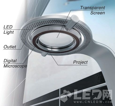 iWash看起来和一般感应水龙头没有太大区别,只是造型变成了大圆盘的花洒状。圆盘的最外层是一圈密集的出水孔,手靠近时会自动感应出水。出水孔内一圈是LED小灯柱,可以显示红、绿两色;最内层则是一圈数字显微镜+圆形显示屏。在这里,你手上所有的细菌都会被识别出来,并且能够放大。