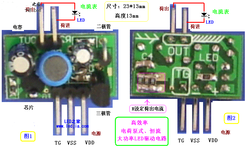 上图的“电源”为正极、“VSS”为负极,模块尺寸:长22mm宽12mm高10mm体积精巧、电路设计微妙、无发热现象、采用电量储能、电荷泵式原理工作。以驱动18颗LED为例说明电路的联接、当然也可以驱动更少LED/或更加多颗LED。聪明的你灵活应用。