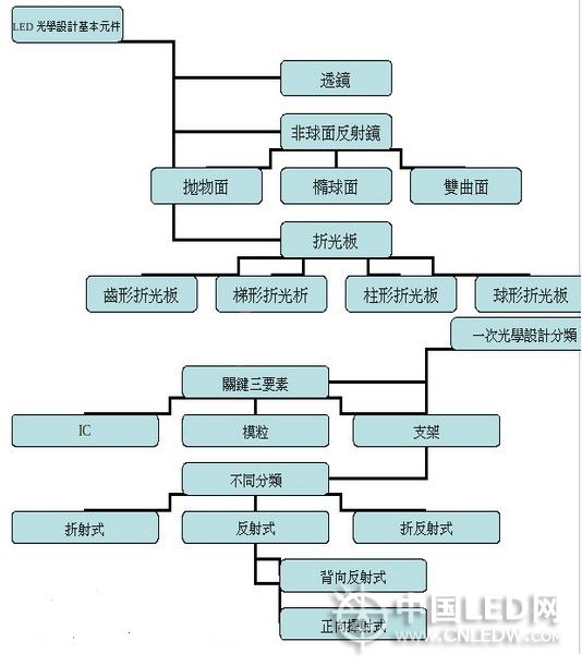 零组件在成为照明产品前,一般要进行两次设计。把 IC封装成LED光电零组件时,要先进行一次光学设计,以解决LED的出光角度、光强、光通量大小、光强分佈、色温的范围与分佈。这就是所谓的一次光学设计。二次光学设计是针对大功率来说:一般大功率LED都有一次,发光角度为120度左右。二次光学就是将经过一次透镜后的光再通过一个光学透镜改变它的光学性能。