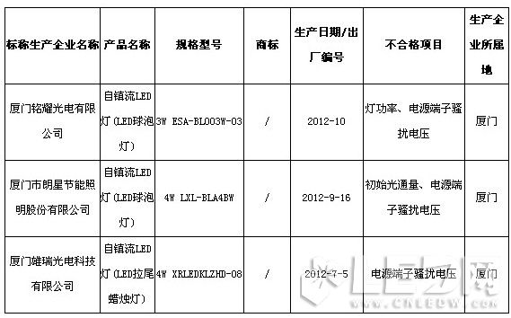 从不合格名单中发现,标称厦门铭耀光电有限公司生产的自镇流灯(LED球泡灯)(规格型号:3WESA-BL003W-03生产日期/出厂编号:2012-10),灯功率、电源端子骚扰电压项目不合格;标称厦门市朗星节能股份有限公司生产的自镇流LED灯(LED球泡灯)(规格型号:4WLXL-BLA4BW生产日期/出厂编号:2012-9-16),初始光通量、电源端子骚扰电压项目不合格;标称厦门雄瑞光电科技有限公司生产的自镇流LED灯(LED拉尾蜡烛灯)(规格型号:4WXRLEDKLZHD-08生产日期/出厂编号:2012-7-5),电源端子骚扰电压项目不合格。