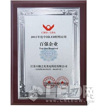 (天楹之光荣获“2012年度中国LED照明应用百强企业”称号)