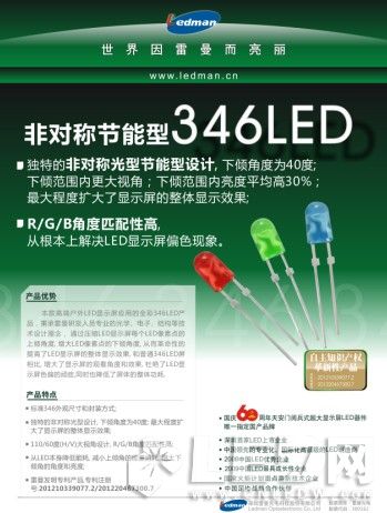 雷曼光电非对称节能型户外346LED全彩LAMP器件产品针对传统户外全彩椭圆器件上视角能量浪费的现状,从根本上解决的节能, 杜绝色偏现象, 增加可视角度, 提升观看效果。该产品顺应节能环保理念,为客户带来整屏功耗节电20%~30%的附加价值,并已获得两项国家专利,专利号分别是:201210339077.2和201220467300.7。