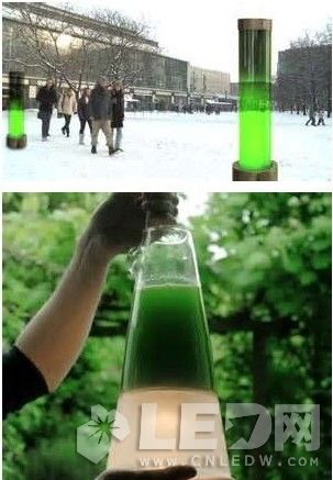 Latro lamp该灯采用的电能是通过生物反应得到,在一个圆锥形的瓶子中插入30纳米宽的电极作用于瓶中的海藻叶绿体,只要将其放置在阳光下供给二氧化碳、水就能快速生长。这个装置可以将其产生的电流储存起来提供给作为电能使用。
