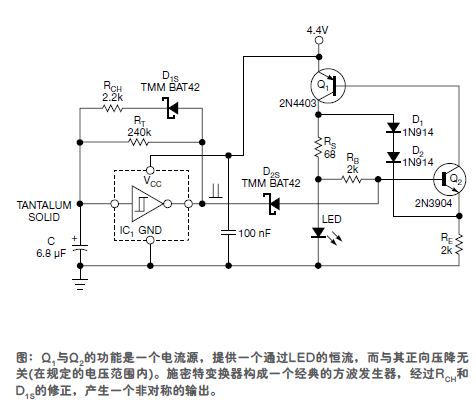 LED驱动器包括一个PNP双极晶体管Q1和一个NPN双极晶体管Q2.Q1与Q2构成一个可转换电流源。当肖特基二极管D2S阴极有高逻辑电平时,LED通过一个恒流,电流值约为IO≈0.7V/RS,本电路中为10mA.
