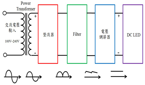 DC LED以直流电流源驱动(图9),其元件具备体积小、发光效率高等诸多优点,可应用于显示、车用、指示、装饰及照明等广泛的应用领域,惟须外加交直流电源转换电路,使得市电高电压交流电可以降压,并转为低电压直流电来驱动DC LED,此外,电源转换电路亦往往造成能源的损耗。